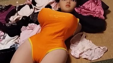 オレンジのレオタード姿の爆乳のラブドールのマ〇コをさわり乳首をコロコロと転がしたりといやらしくさまりまくる